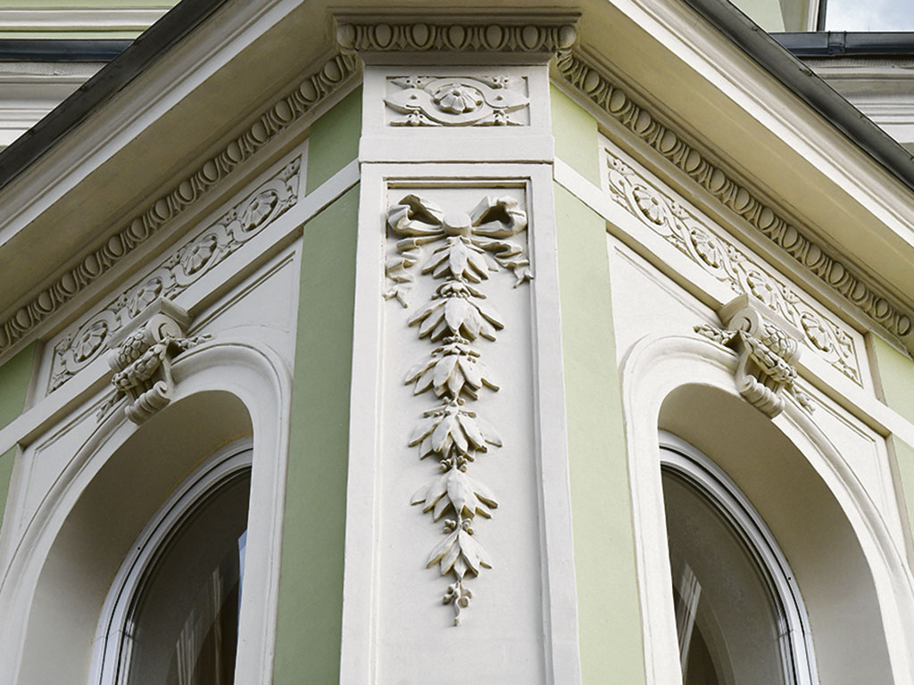 В частности, восстановительным работам подверглись кирпичная кладка и штукатурная отделка фасадов, цоколя, пилонов ворот и аттика, а также декоративные элементы лепного фасадного декора: карнизы, тяги, сандрики, откосы. В последнем случае были произведены догипсовка фрагментов и заделка выбоин, выполнена шлифовка поверхностей, укрепление грунтовкой и окраска.