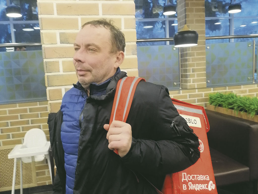 Сложнее всего почему-то разговорить пеших курьеров. Устав бегать за ними под хлопьями мокрого снега, прячусь от холода в кафе и едва не спотыкаюсь о стоящий на полу большой жёлтый рюкзак с надписью «Доставка». Его обладатель спокойно ждёт заказ и, кажется, никуда не спешит. Пользуясь моментом, подсаживаюсь к нему за столик.