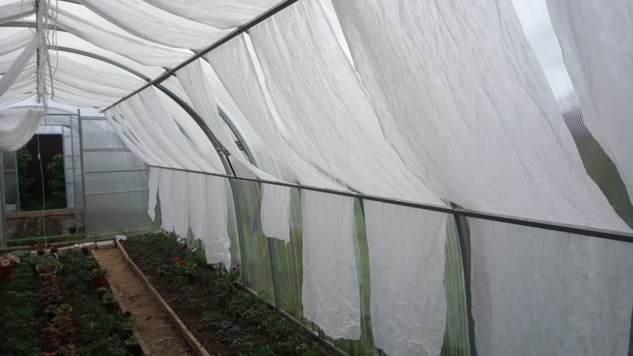Белить можно только стеклянные теплицы. Если же у вас поликарбонатная, то единственный безопасный вариант — накрывать её. Чтобы материал не сдувало ветром, мы использовали простой, но эффективный способ: связывали попарно пластиковые бутылки с водой длинной верёвкой и перекидывали их через теплицу, создавая натяжение и прижимая ткань. Несколько таких «бандажей» выдерживали даже сильный ветер. Правда, под форточку приходилось вырезать отверстие в нетканке — тут уж приходилось выбирать между комфортом растений и удобством проветривания. Кстати, сначала удобнее перебросить пустые бутылки, а уже потом наполнять их водой