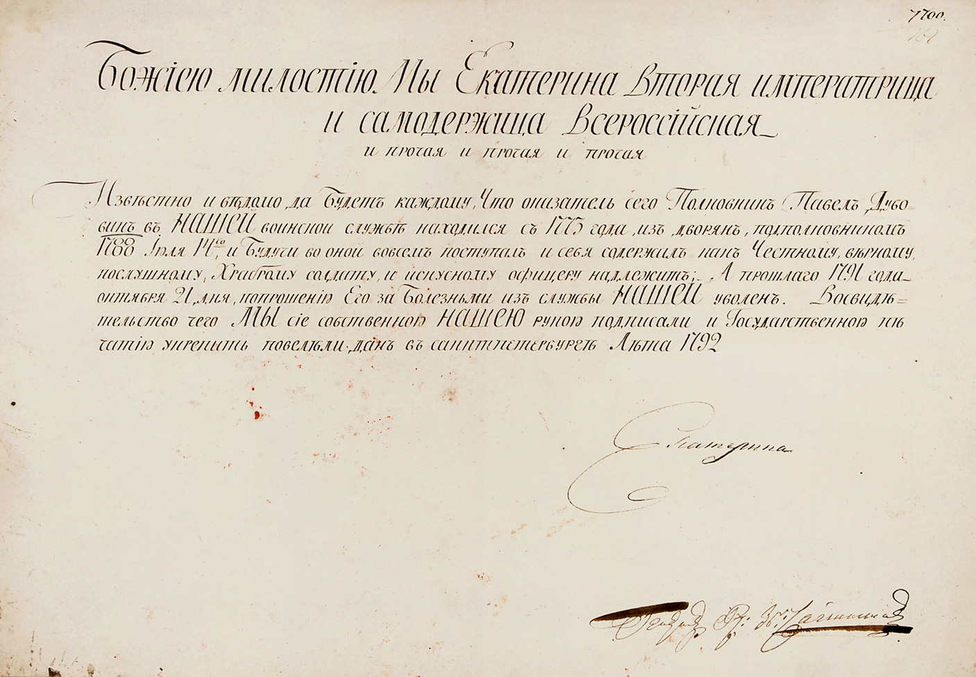Обращает на себя внимание автограф императрицы Екатерины II, оставленный в 1792 г. на свидетельстве об увольнении со службы полковника П. Дубовина и другие уники.