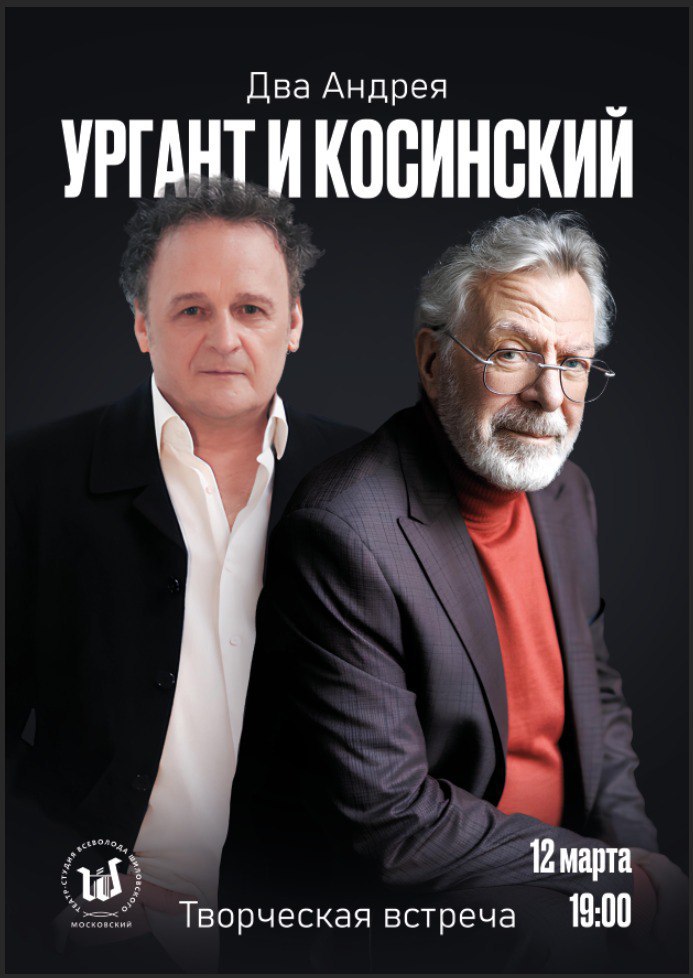 12 марта в 19:00 в Театре Всеволода Шиловского состоится мультижанровый концерт «Два Андрея. Ургант и Косинский», где будет воссоздана особенная, искренняя атмосфера петербургского вечера, где выступит дуэт интеллигентов, любимцев публики, известных представителей северной столицы.